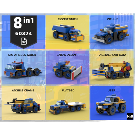 Eight custom alternate models made from parts of the LEGO 60324 Mobile Crane.